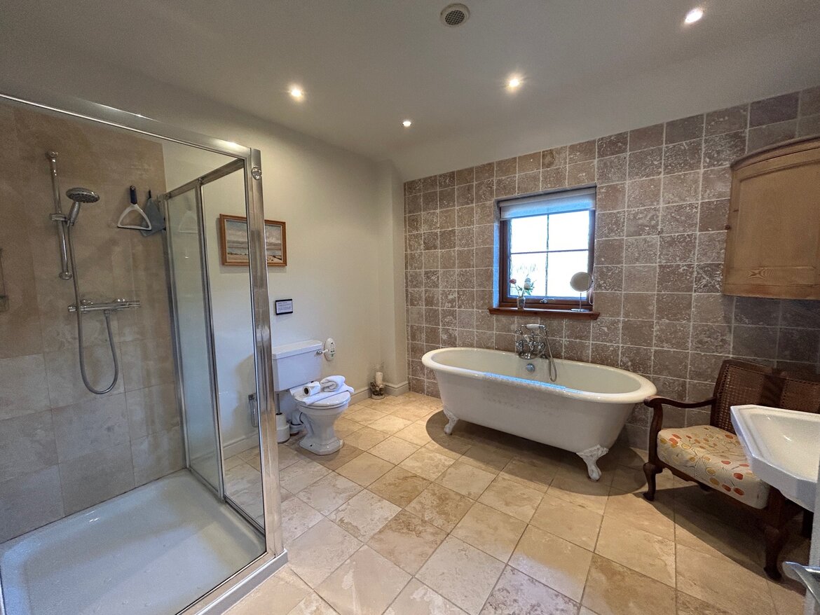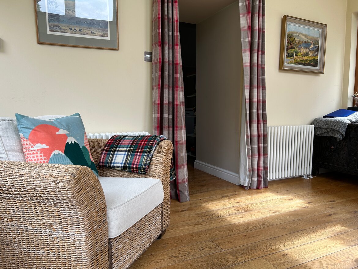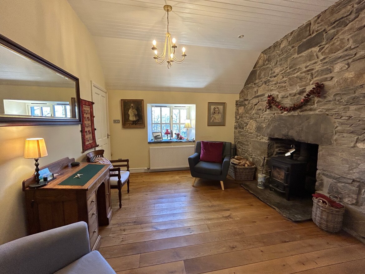 Entrance hall with hanging space for outdoor gear which leads to the snug sitting room with a wood burning stove. The modern three bedroom wing with laundry room and family bathroom, leads off the snug. The other side of the snug a corridor leads to the shower room with toilet and washbasin, the open plan kitchen/dining room and sitting room. The sunroom is accessed from the kitchen and the sunroom doors lead out to the patio and garden with outdoor table and chairs, BBQ and pizza oven.