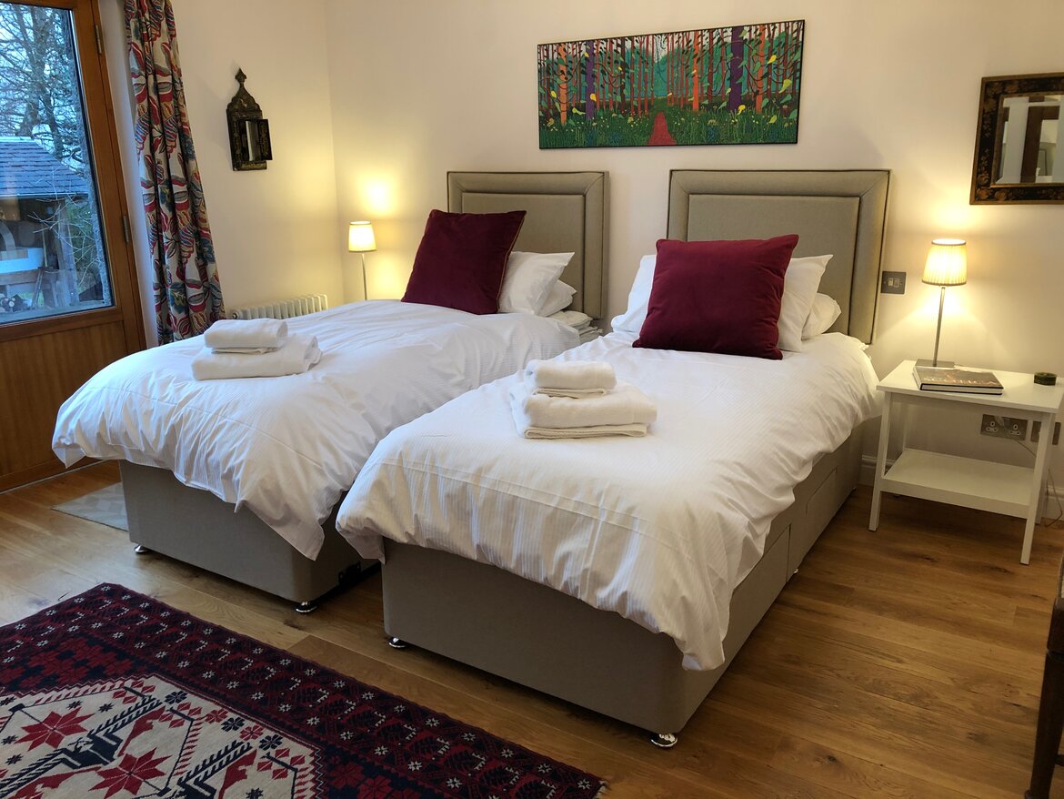 Upper mezzanine floor with two single beds - coomb ceiling so restricted headspace but full height in centre of the room.