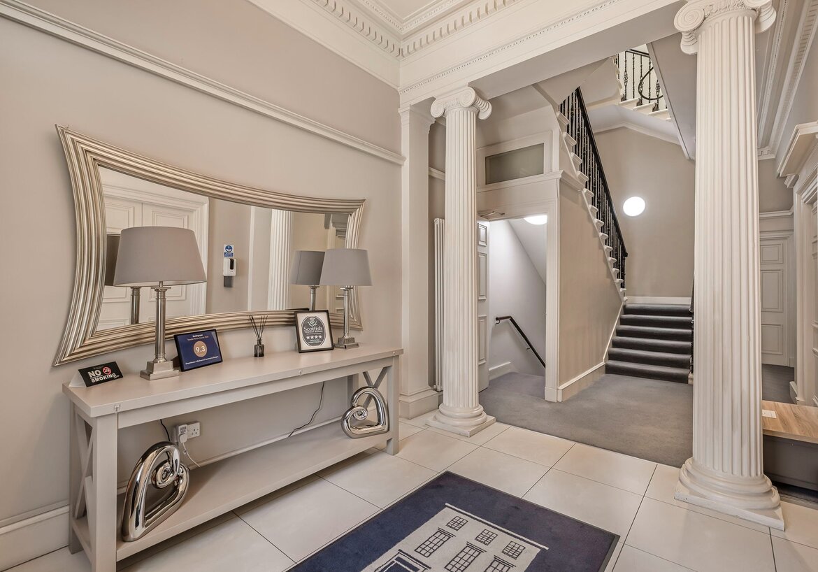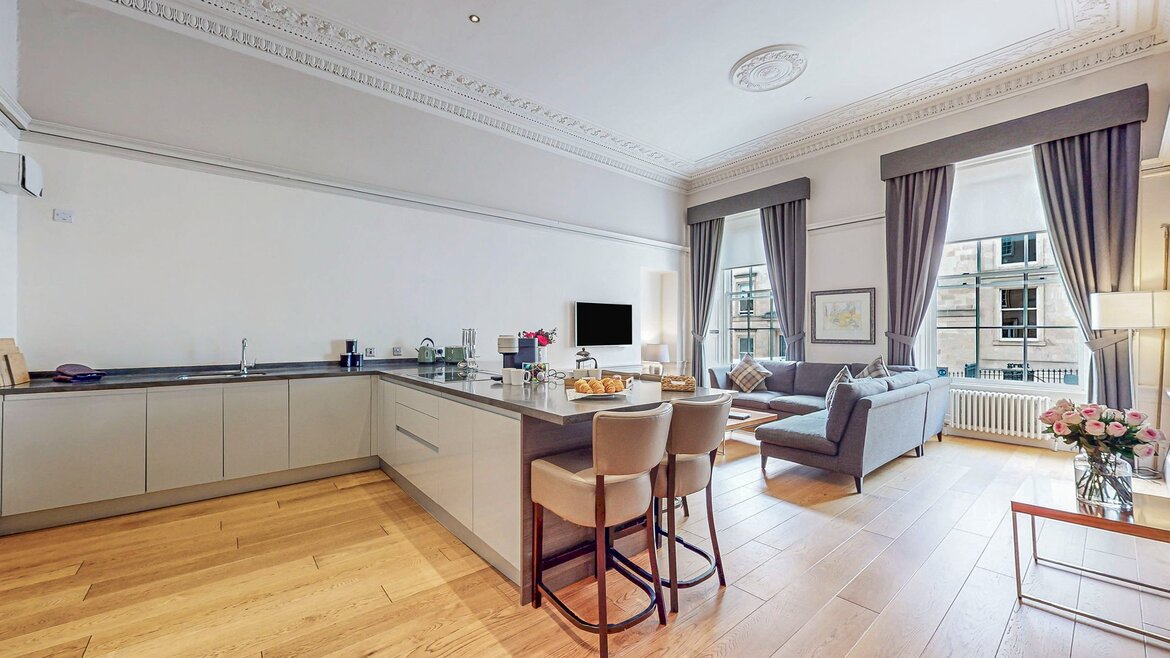 Welcome to your stylish city retreat in the heart of Glasgow. This deluxe two-bedroom, one-bathroom apartment, located within the Blythswood Apartments on West George Street, combines classic character with contemporary design.